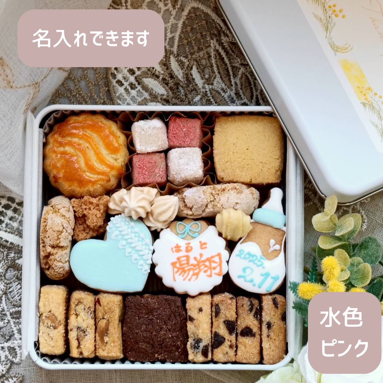 ご妊娠、ご出産のお祝いや内祝いなどに、スタイや哺乳瓶のアイシングクッキーが入った15種類のクッキー缶はいかがでしょうか。